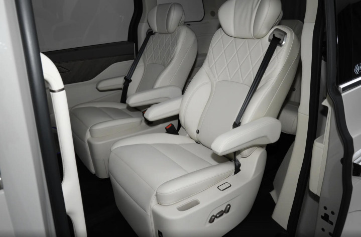 座椅的布局采用的是2+2+3的布局形式,而且这款车辆所采用的是真皮的材质,真皮材质非常富有质感,就好像是在家中的高品质沙发一样,尤其是前排的座椅,可以预留出非常充足的空间,让大家进行车辆驾驶的时候都比较的轻松自在。第二排的座椅采用的是独立的座椅,而且是招财猫座椅,是非常富有理念的,打造出犹如航空头等舱的乘坐体验。而且座椅还配备有一键躺平的功能,大家坐在座椅上的时候,可以缓缓的将靠背向后倾斜,然后就可以感受到一种非常舒适的坐姿体验。座椅的前后滑动距离也是比较远的,而且第二排的通道非常的宽敞,方便大家进入到第三排座椅中。像其他的一些传统的MPV车辆,在第三排的座椅设计的时候,常常会忽略了它的舒适性,但是这款车辆的第三排座椅依然是坚持着它不将就的舒适座位,大家不用蜷缩的坐在第三排的座椅上,即使是后排同时乘坐三位成年人也不会显得拥挤,而且中间乘客的舒适性也能够得到很好的保障。然后再来看一下座椅的功能性,前排座椅具有加热,通风,记忆和按摩的功能,第二排座椅具有加热和通风的功能。所以大家能够感受到多元化的舒适性,在夏天以及在冬天的时候,座椅表面的舒适感都是很相似的,夏天不会出现闷热的黏腻感,冬天的时候又不会觉得冰凉,所以可以让大家坐在座椅上的时候,可以感受到满满的惬意性。然后我们再来看这款车辆的空间,作为一款中大型MPV车辆,空间自然是非常大气的,每一个座位都可以为大家留出来比较充足的活动空间,大家可以自由的伸展四肢,同时行李舱内的容积也是相当大的,行李舱容积达到了233~1725L,大家就可以将自己出行的货物或者是办公所需要的文件等都放置在后备箱中。而且后排座椅可以按照40:60的比例放倒,这样可以使得后排变成一个比较纯平的区域,大家就能够舒适的躺在后排了。